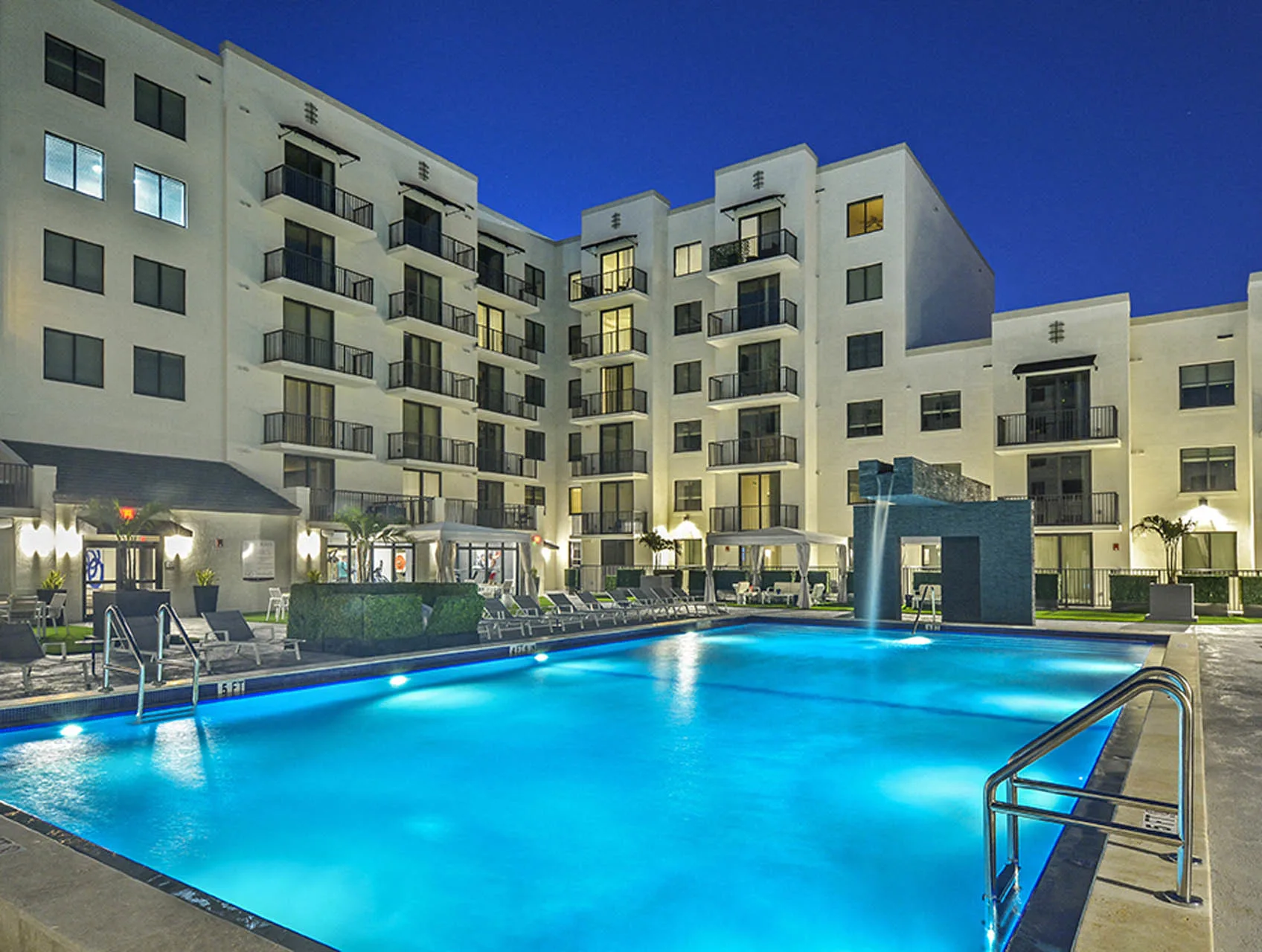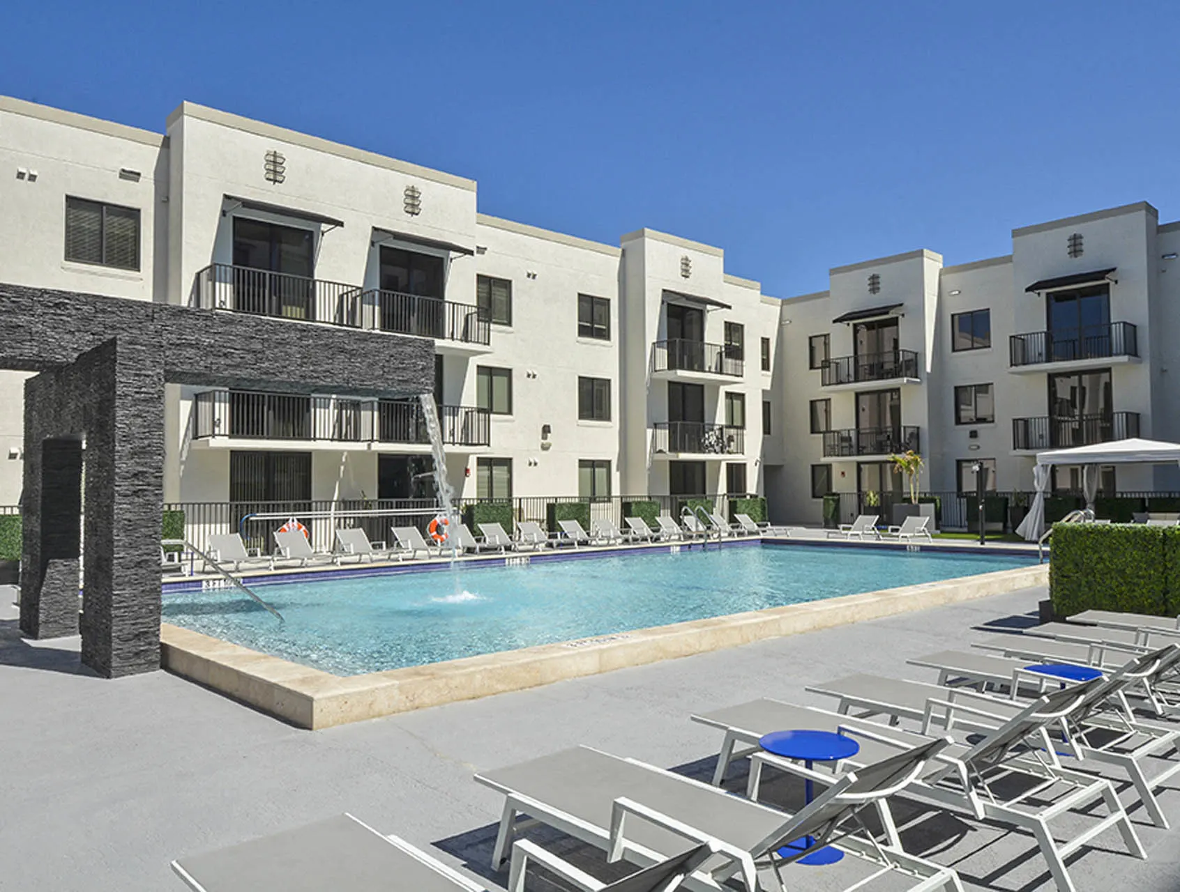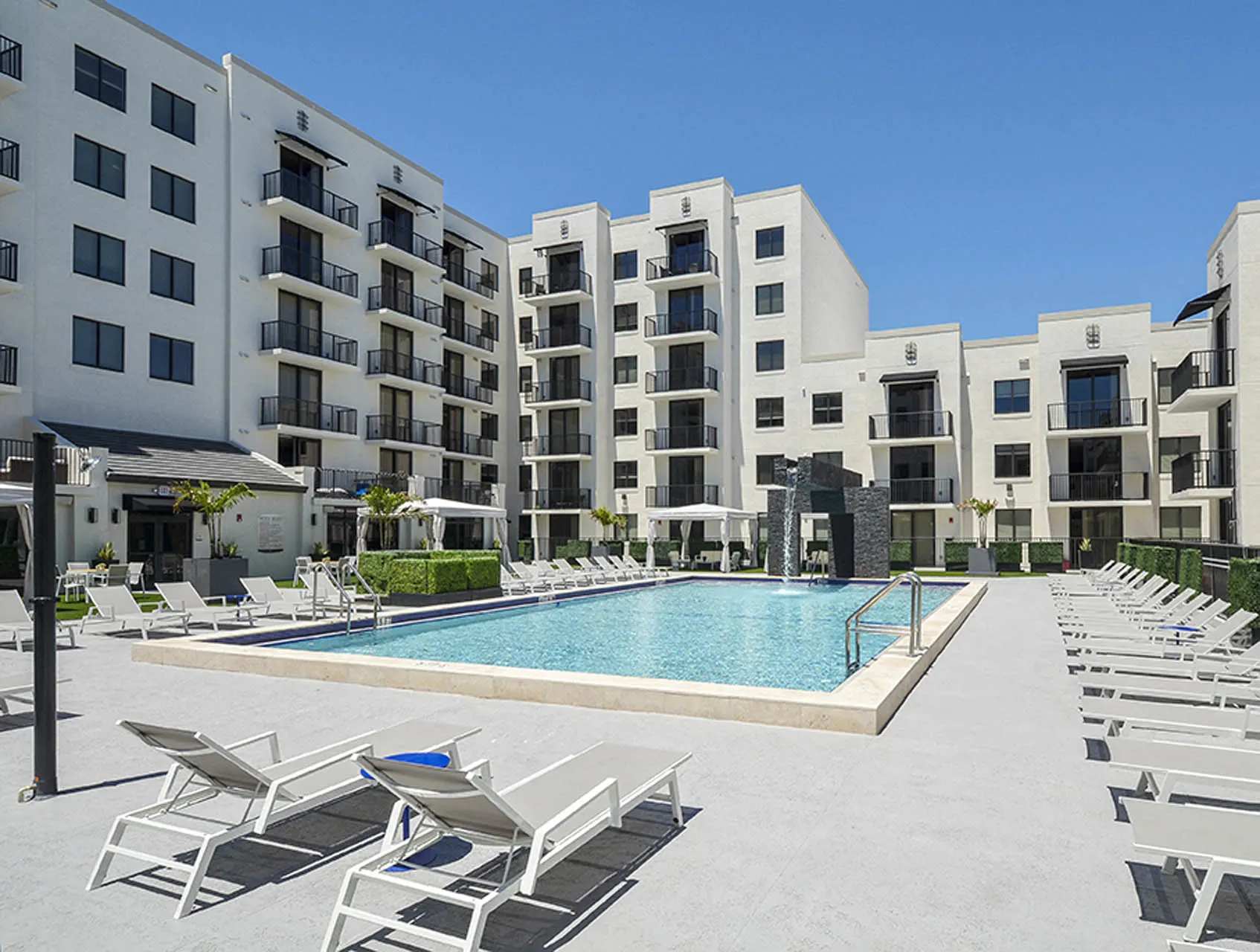 District West Gables in West Miami, Florida, offers luxury studio, one-, two-, and three-bedroom apartments ranging from 550 to 1,250 square feet. Each unit features gourmet kitchens with granite countertops, dishwashers, side-by-side refrigerators, electronic thermostats, central air conditioning, 9-foot ceilings, and scenic views.