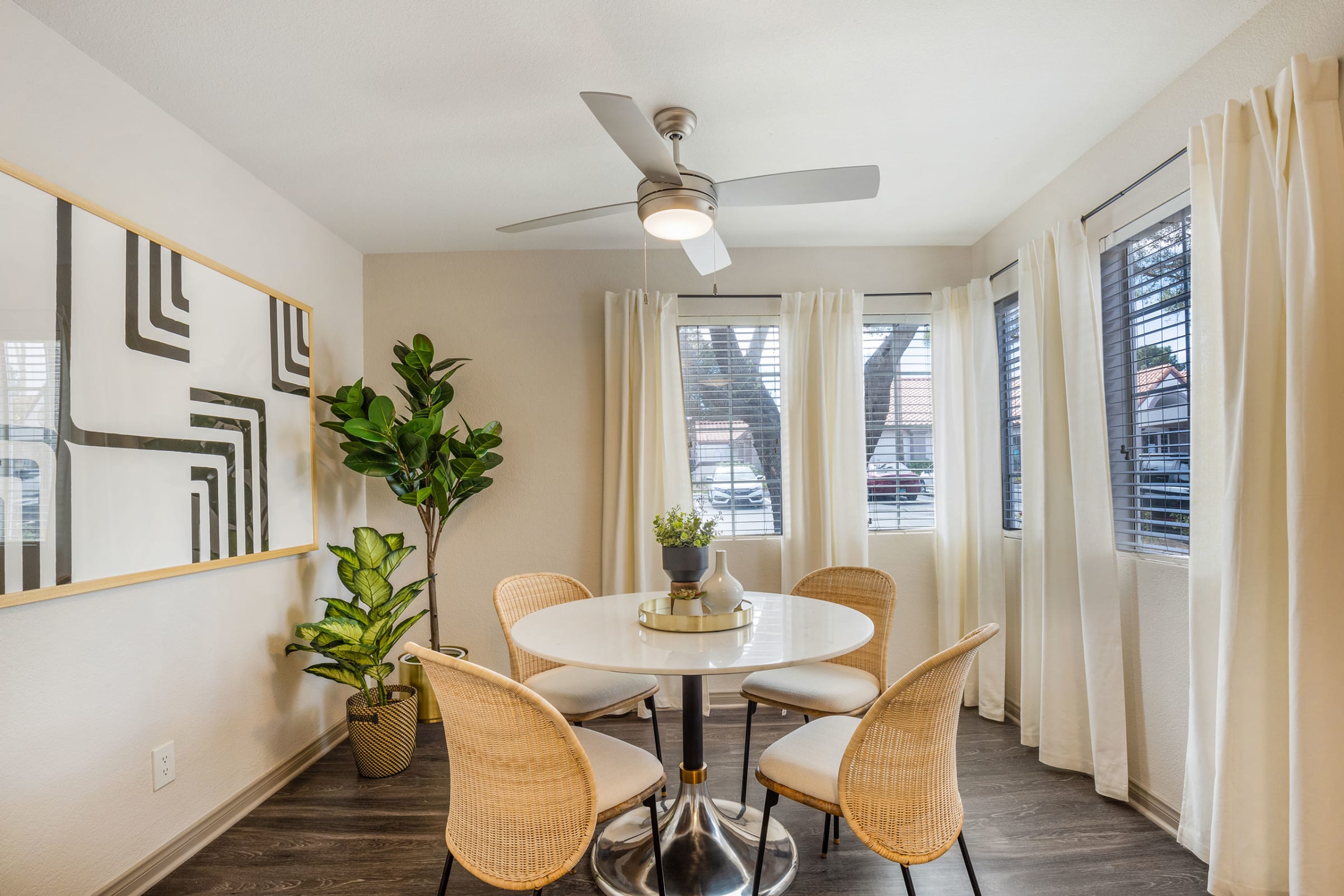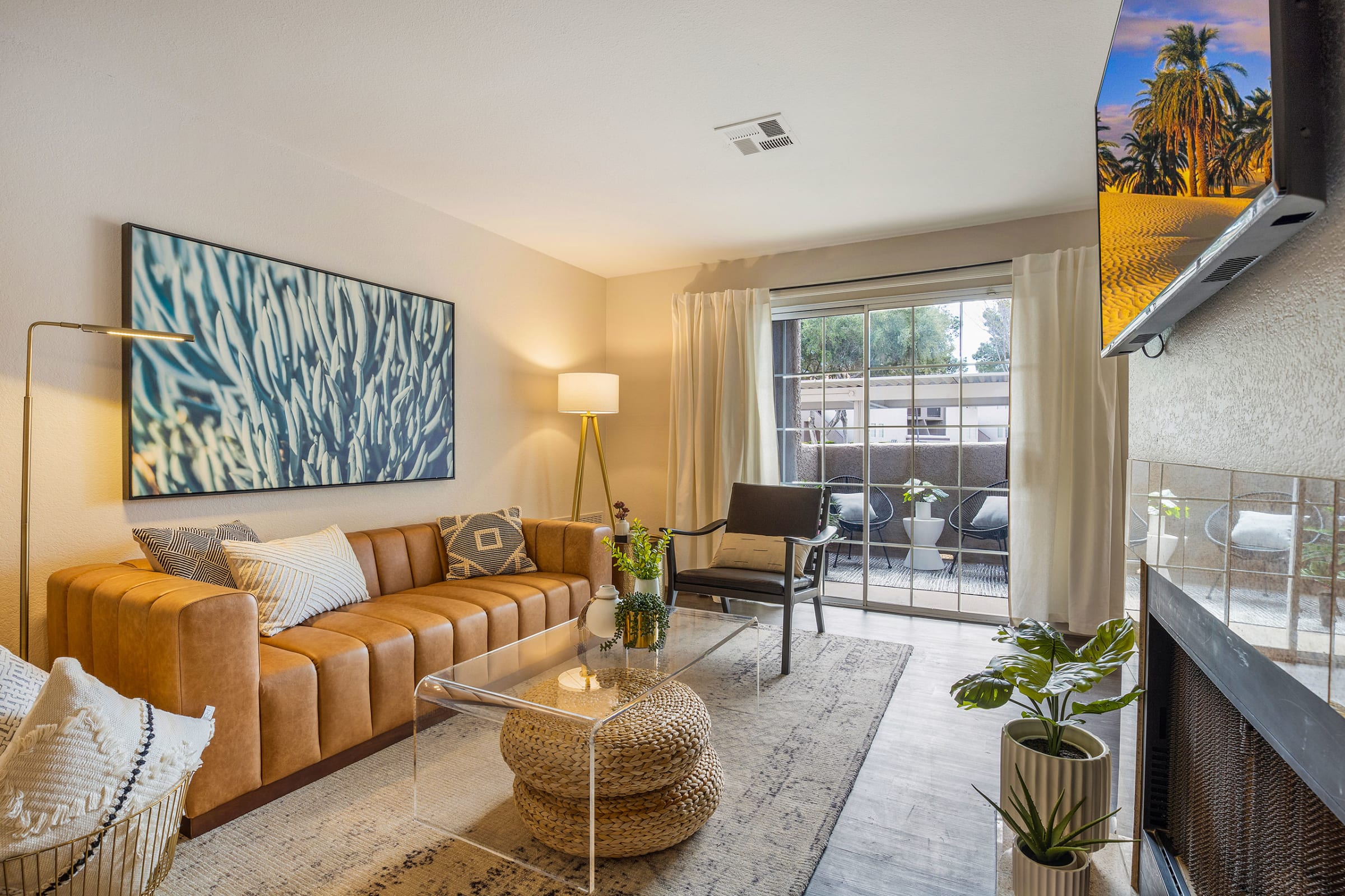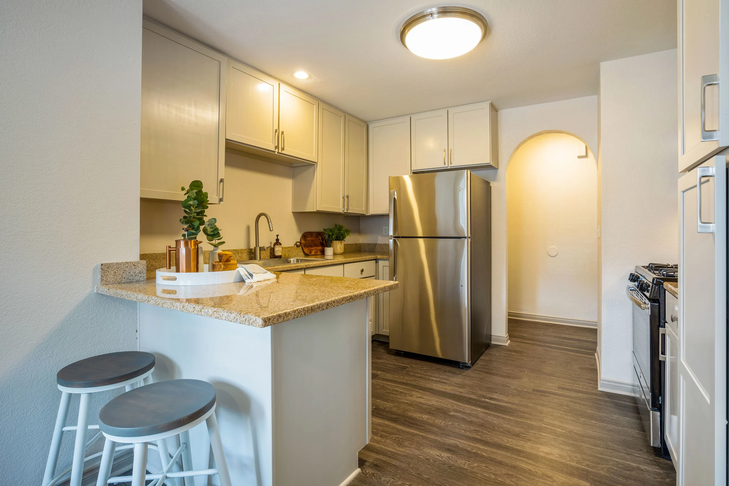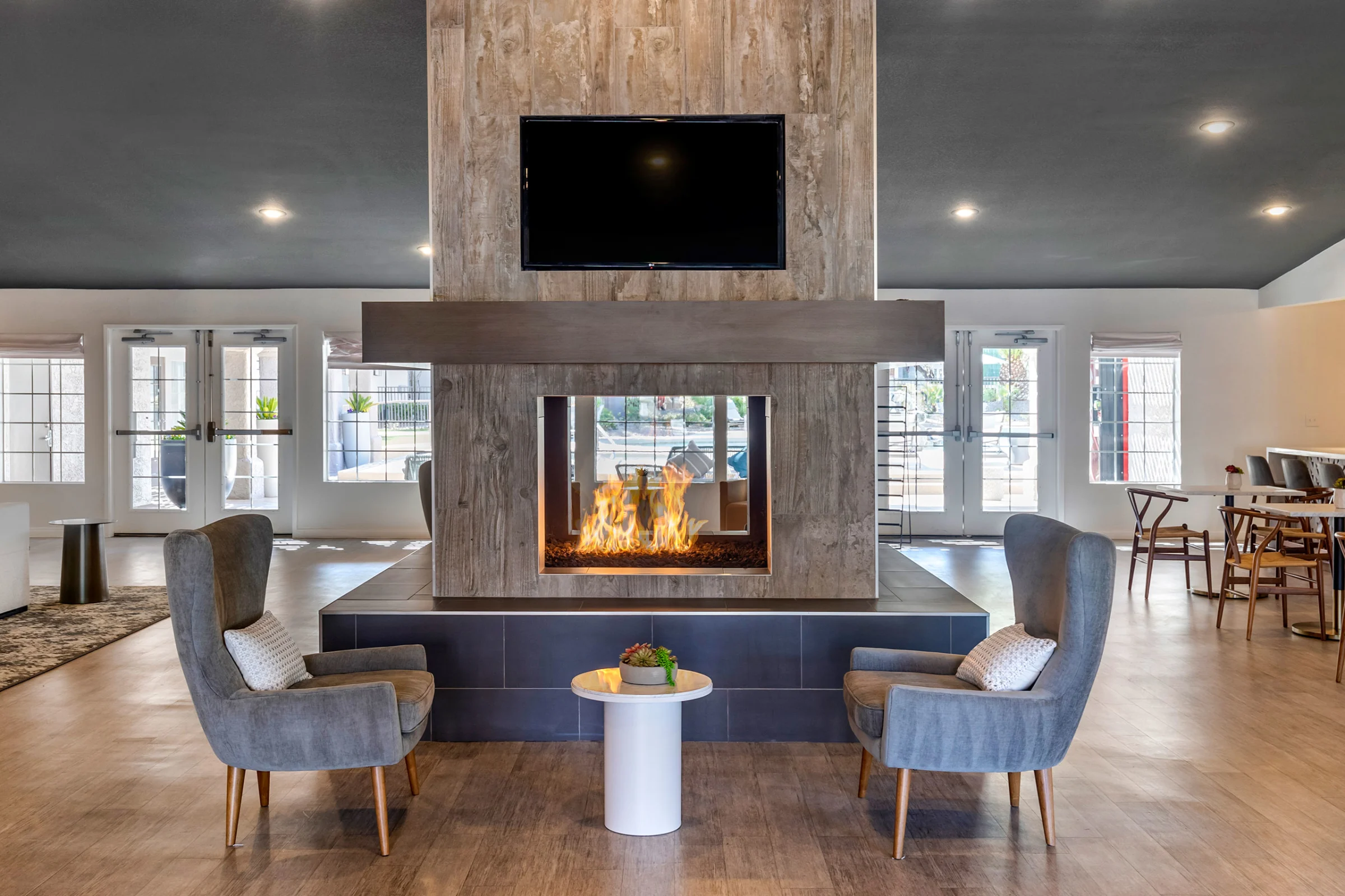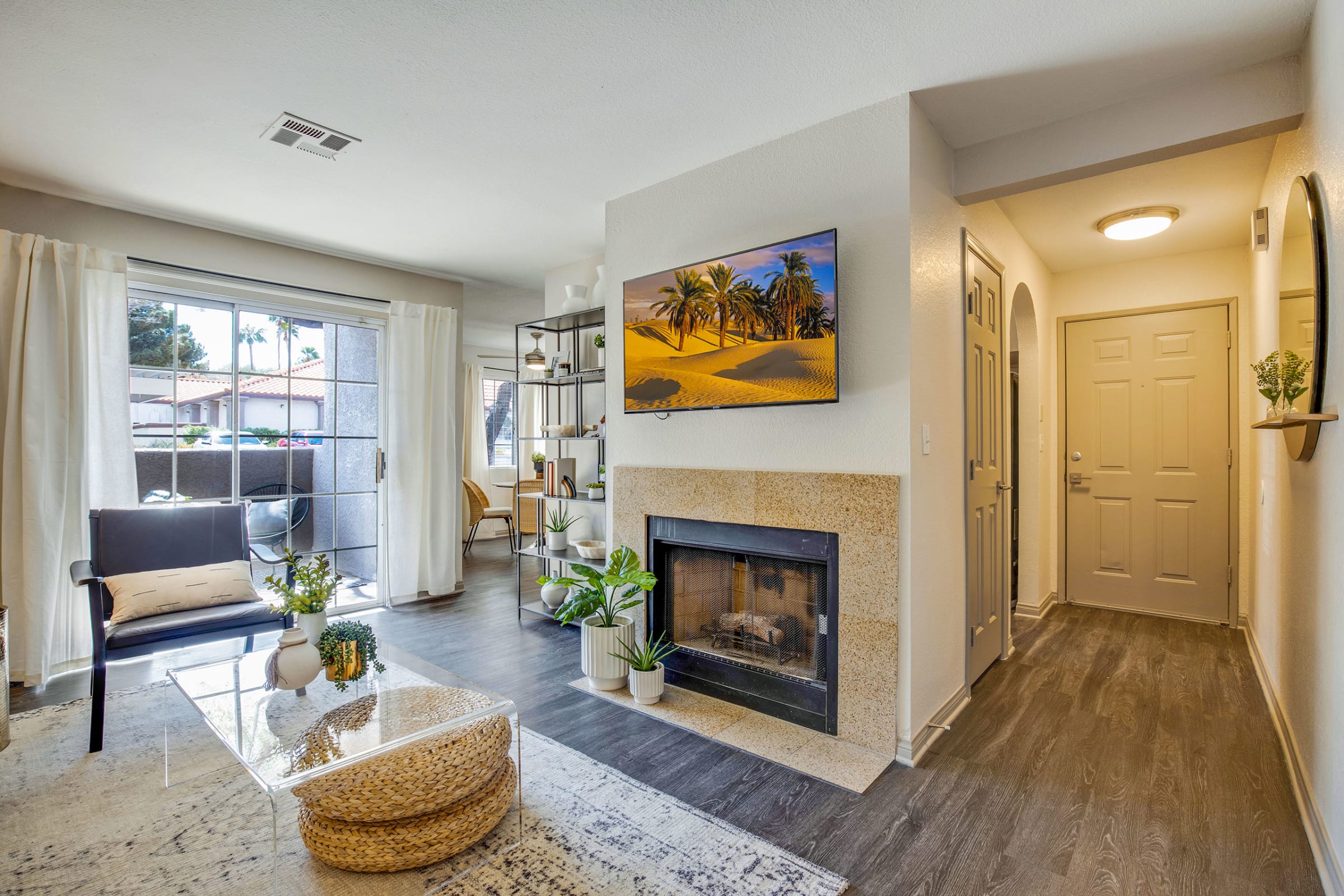 Fairways on Green Valley in Henderson, Nevada, offers one- and two-bedroom apartments designed for modern comfort. Each unit features a cozy fireplace, air conditioning, stainless steel appliances—including a gas stove and built-in microwave—and a Roman bathtub. Additional conveniences include a stacked washer and dryer, ceiling fans, and private patios or balconies.